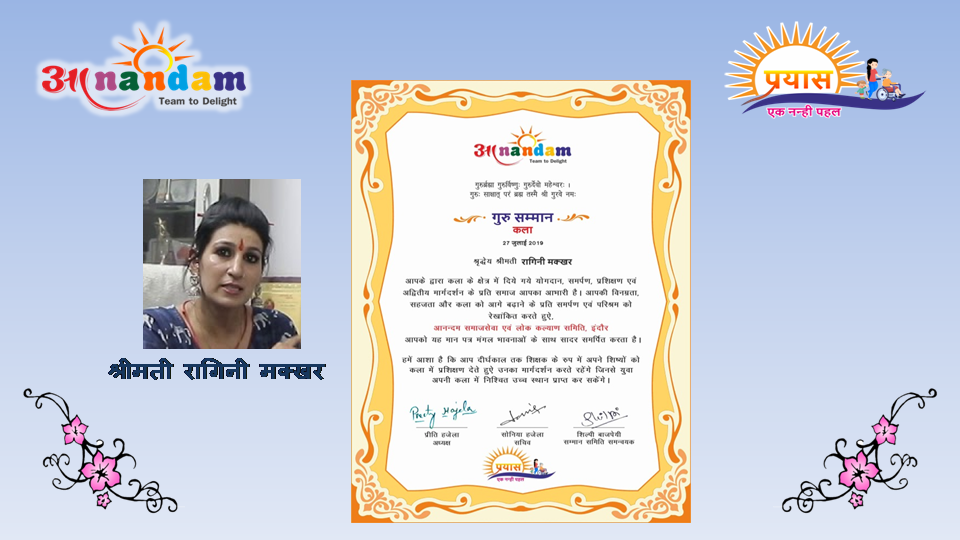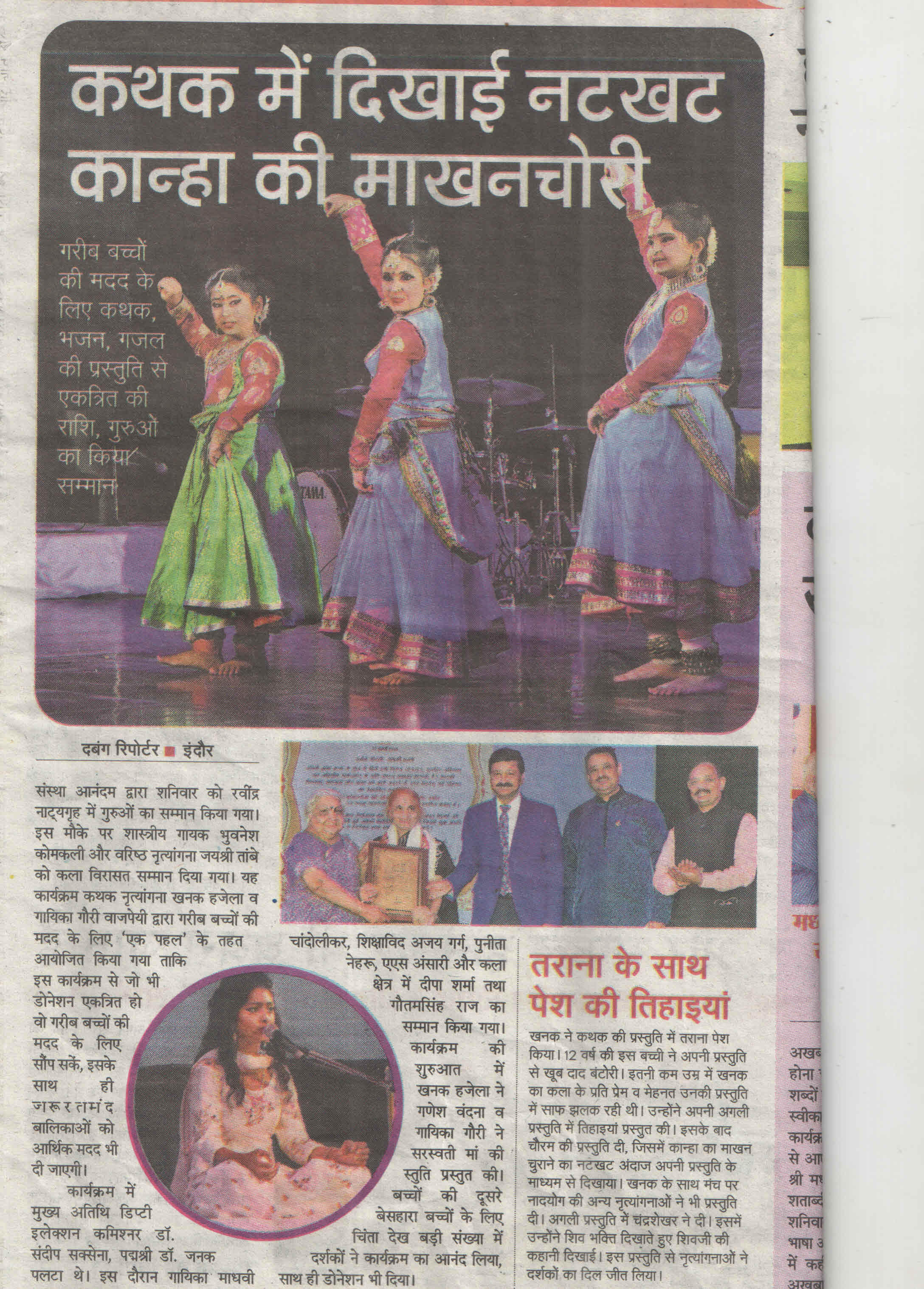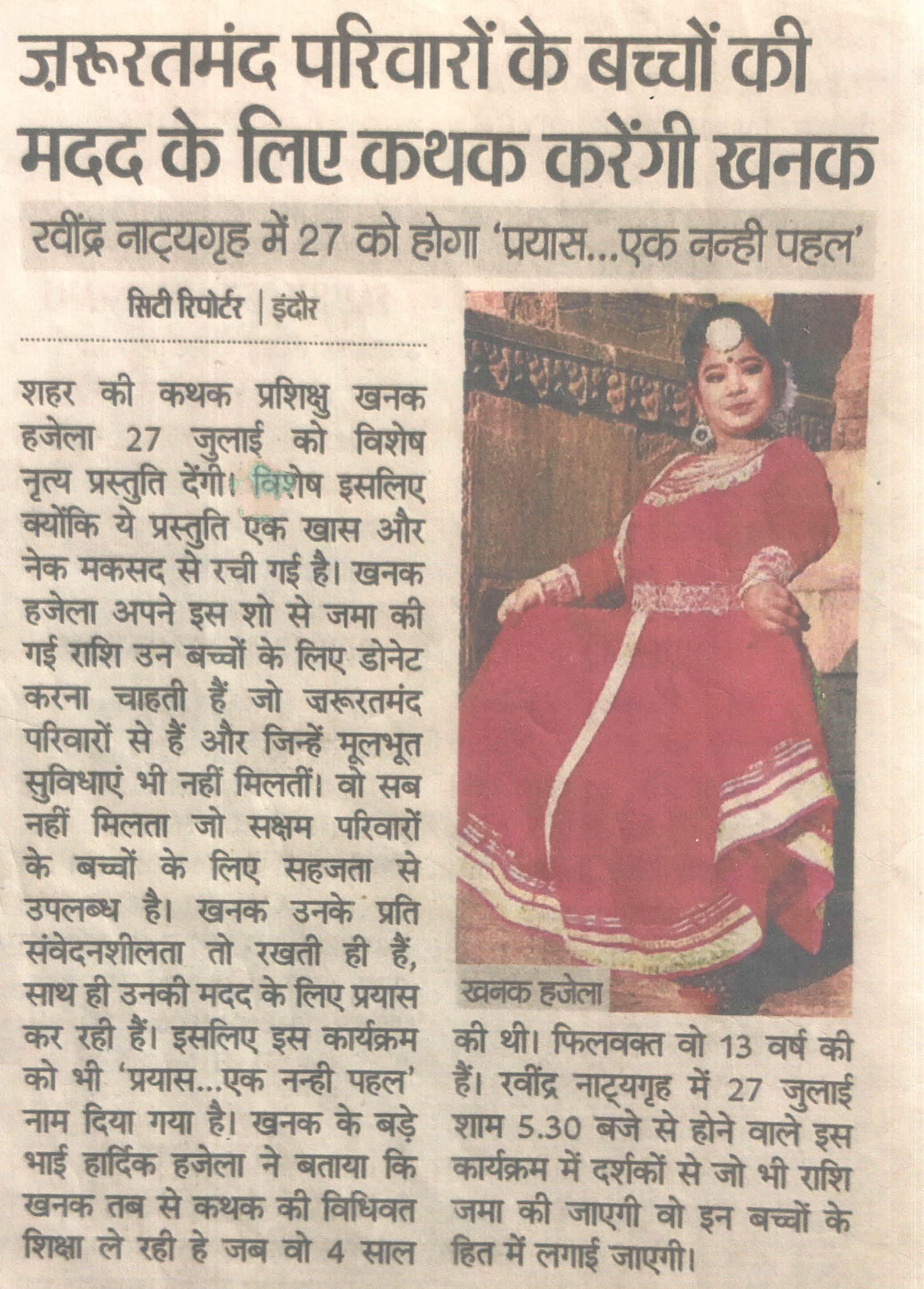Marching towards the mission , Khanak Hajela a delightful socio economic Kalakar ,student of Delhi Public School - Indore and Naadyog with her Guru Maa Dr. Ragini Makkhar presents an evening "Prayas.... Ek Nanhi Pehal" on 23rd May 2020. An evening of maiden performance of Kathak by Khanak with the blessings of her Guru Maa Dr. Ragini Makkhar, who is an alumni of Lucknow Gharana and has privilege to be trained by world renowned Kathak exponent Smt. Sitara Devi. Dr. Ragini Makkhar continued the learning under the prudent guidance of great Kathak Guru Smt. Shama Bhate and Tabla maestro Padam Shri Pt. Suresh Talwalkar.
